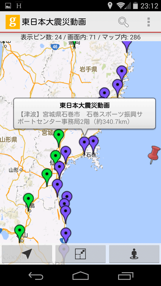 ※このマップから参照される動画には、津波被害の様子など、なまなましい映像が含まれています。視聴にあたってはご注意ください。