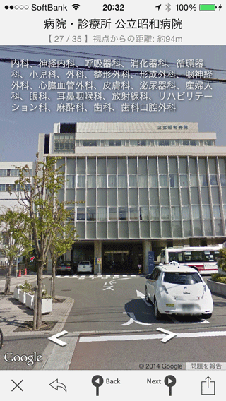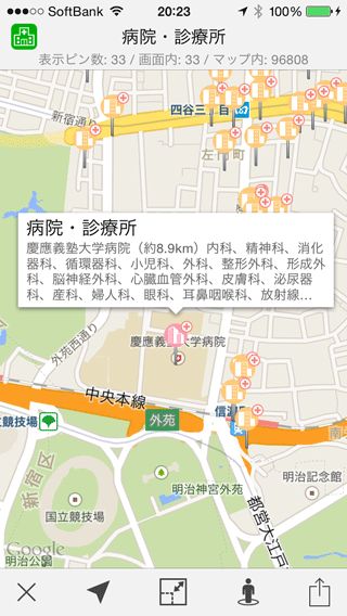 病院・診療所の詳細情報を知りたければ、マップ上のピンをタップしてバルーンを表示してください。すると上の画面のように、画面上部に診療科の情報が表示されます。さらにバルーンをタップして詳細ページを開くと、その病院・診療所名でGoogle検索を実行した結果が表示されます。