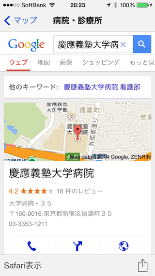 詳細ページを表示すると、病院・診療所名でGoogle検索した結果が表示されます。