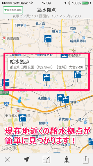 万一震災が発生して、水道水の供給が遮断されたら、給水拠点に行って生活用水を確保しなければなりません。皆さんは、自宅に一番近い給水拠点をご存じでしょうか? この「東京都の給水拠点」マップは、東京都水道局から情報提供を受け、ロケスマで利用可能なマップとして公開しているものです。マップを開くと、現在地近くの震災時給水拠点がピンで表示されます。マップを表示したら、自宅から一番近そうな給水拠点のピンをタップしてみましょう。上の画面のとおり、ピンをタップすると、バルーンの部分で現在地からの距離を確認できます。