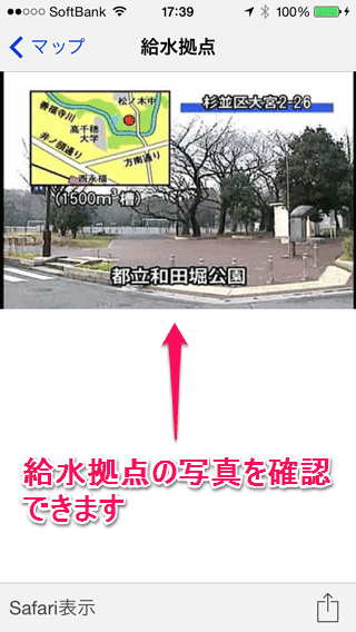ピンのバルーンをタップすると、このように給水拠点の写真を確認できます。