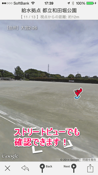 給水拠点の写真は、ロケスマのストリートビュー機能を使って確認することもできます。