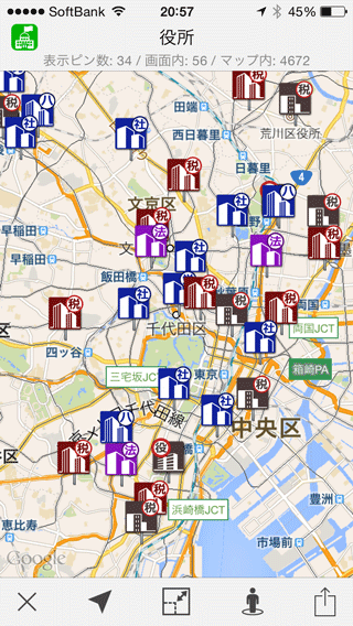 そしてどういうわけか、役所って不便なところにあるもんなんです。そんなときに役立つのがこの役所マップです。具体的には、国土交通省が公開しているデータより、都道府県庁、市役所・区役所、町役場・村役場、税務署、ハローワーク、労働基準監督署、社会保険事務所・局、都道府県税事務所、法務局出張所をまとめて表示します。