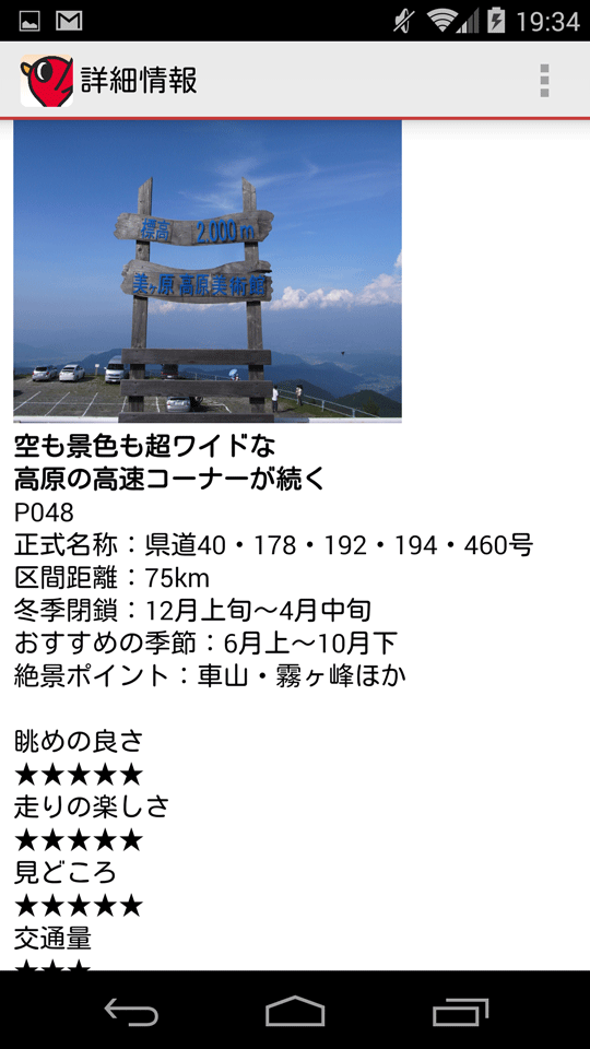 街道の絶景ポイントやおすすめの季節、走りの楽しさなどの評価をチェックできます。