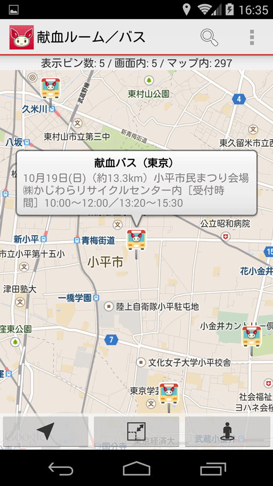 東京都については、次のように献血バスについてもピンが表示されます。お祭りの会場近くなんかに移動バスがきていて献血募集してますよね。